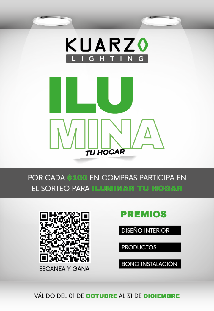 - Por cada compra a partir de $100 en productos KUARZO, el cliente accederá automáticamente al sorteo de un kit completo de diseño e iluminación, especialmente seleccionado para transformar un espacio de hasta 8 m².